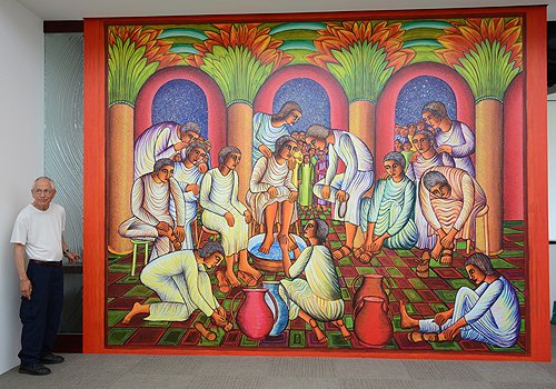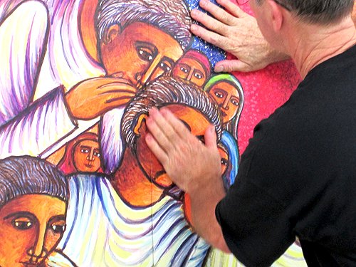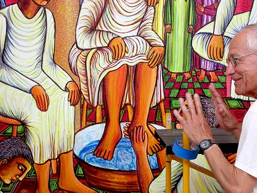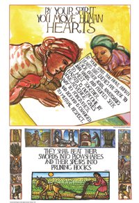 The text of the new book consists of reflections on panels and details of the art written by Marie Dennis, an author working in the field of social justice. Her inspiring words present a man reaching out and caring for others as a model for all people today.