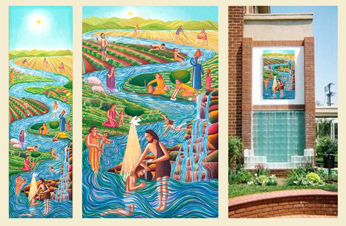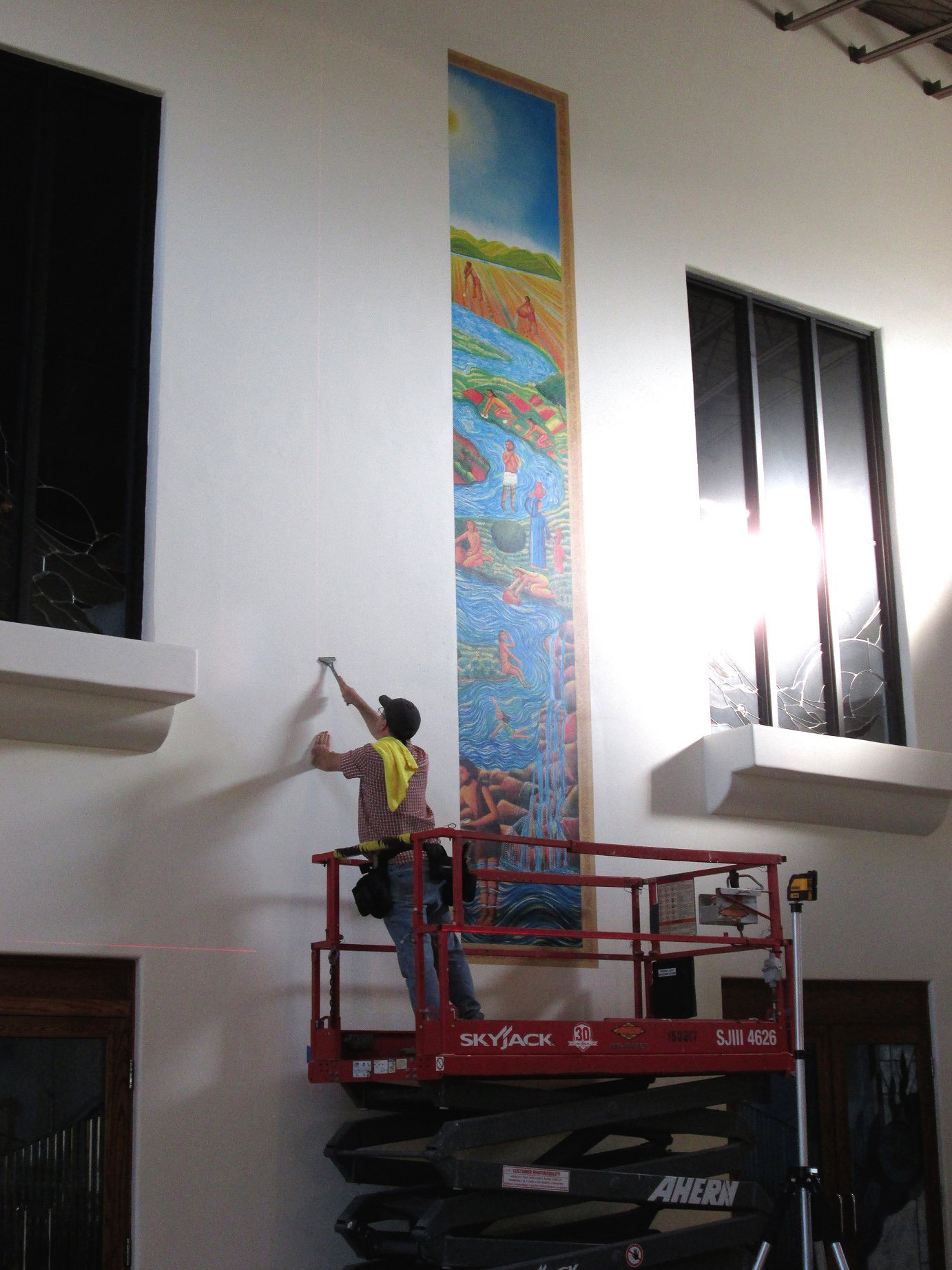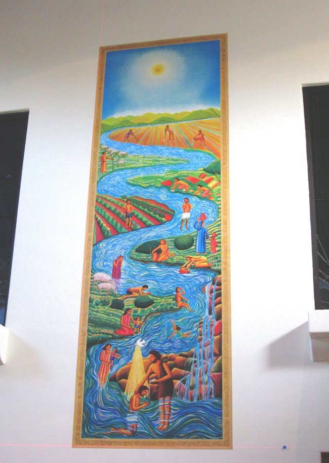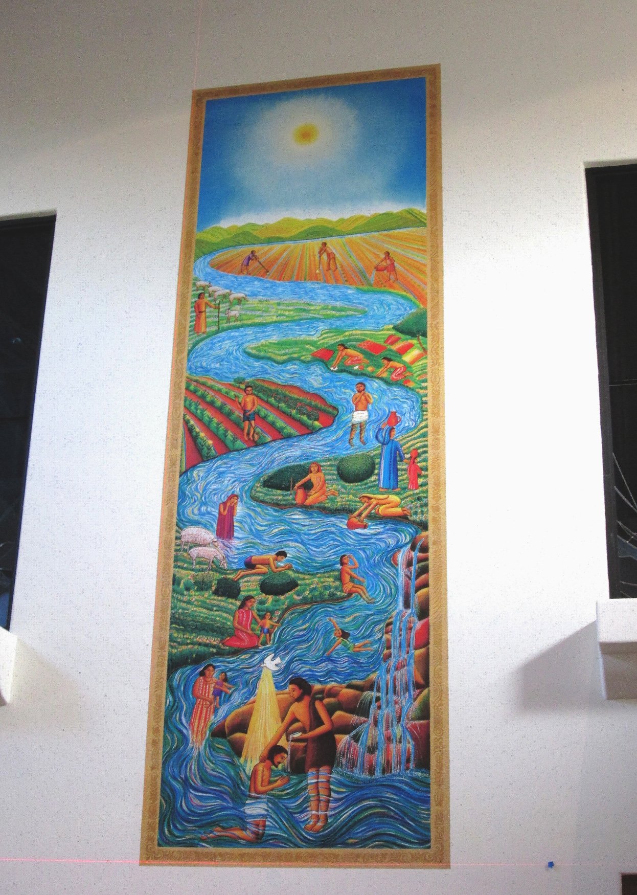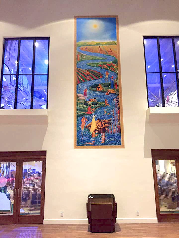 The 18′ x 6′ wall covering of THE RIVER is located in the narthex