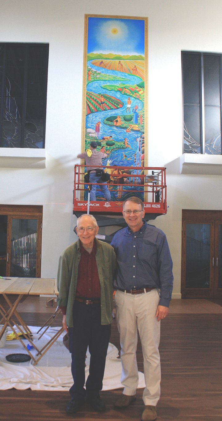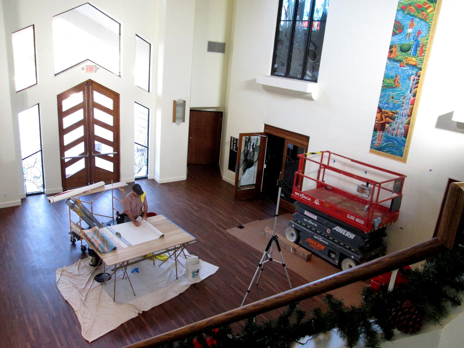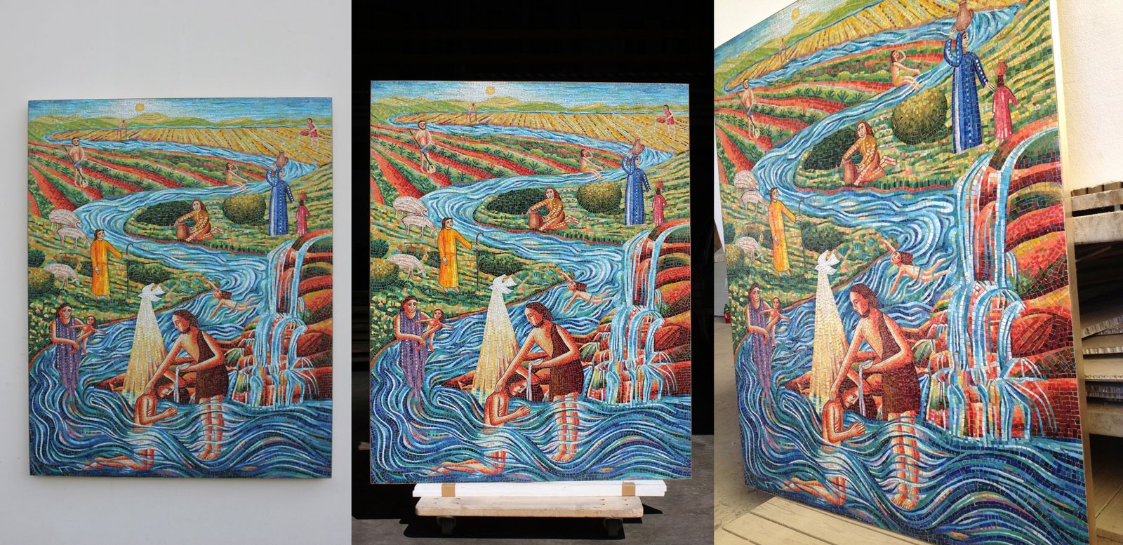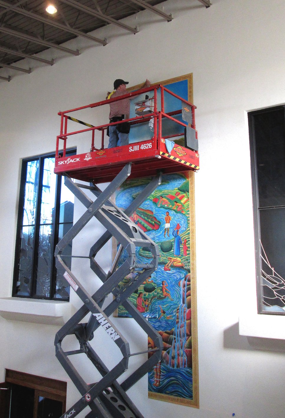 The 18′ x 6′ wall covering of THE RIVER is located in the narthex