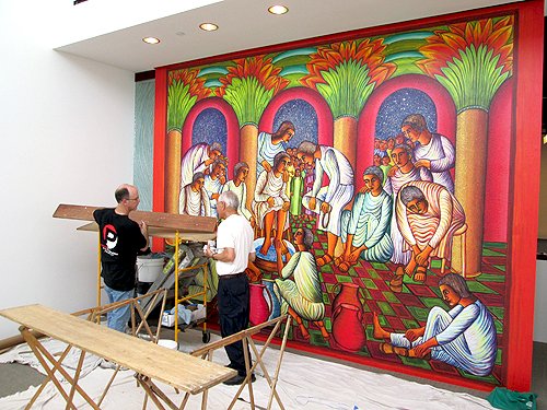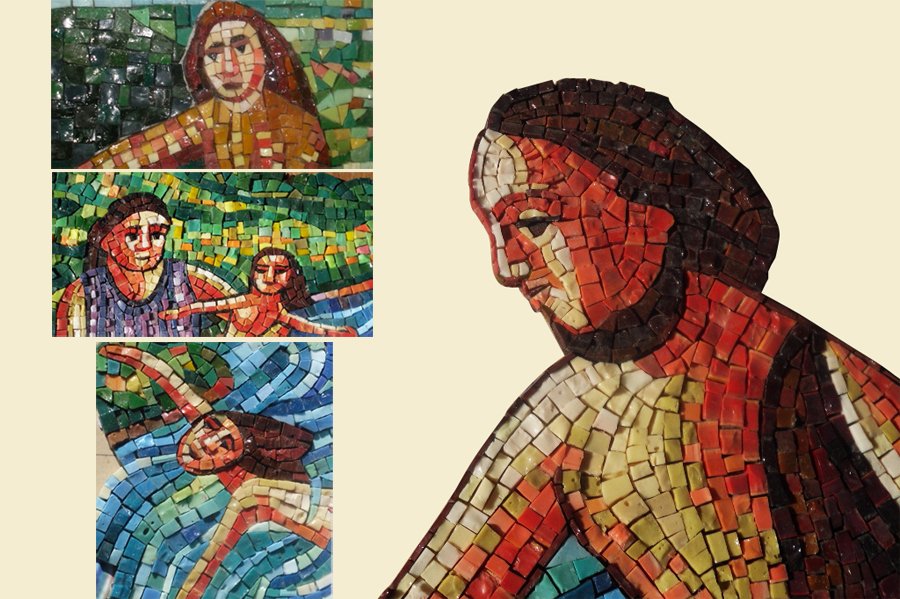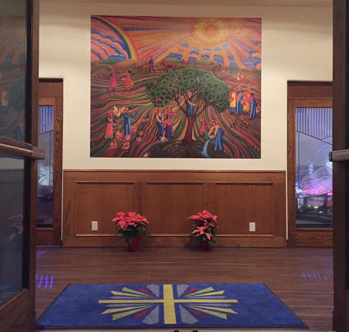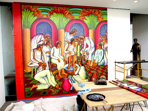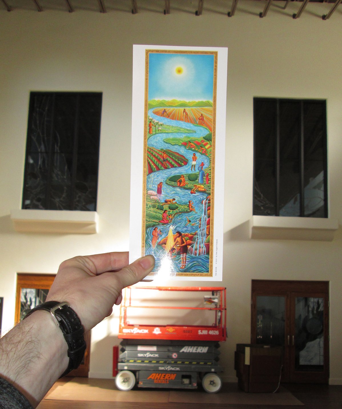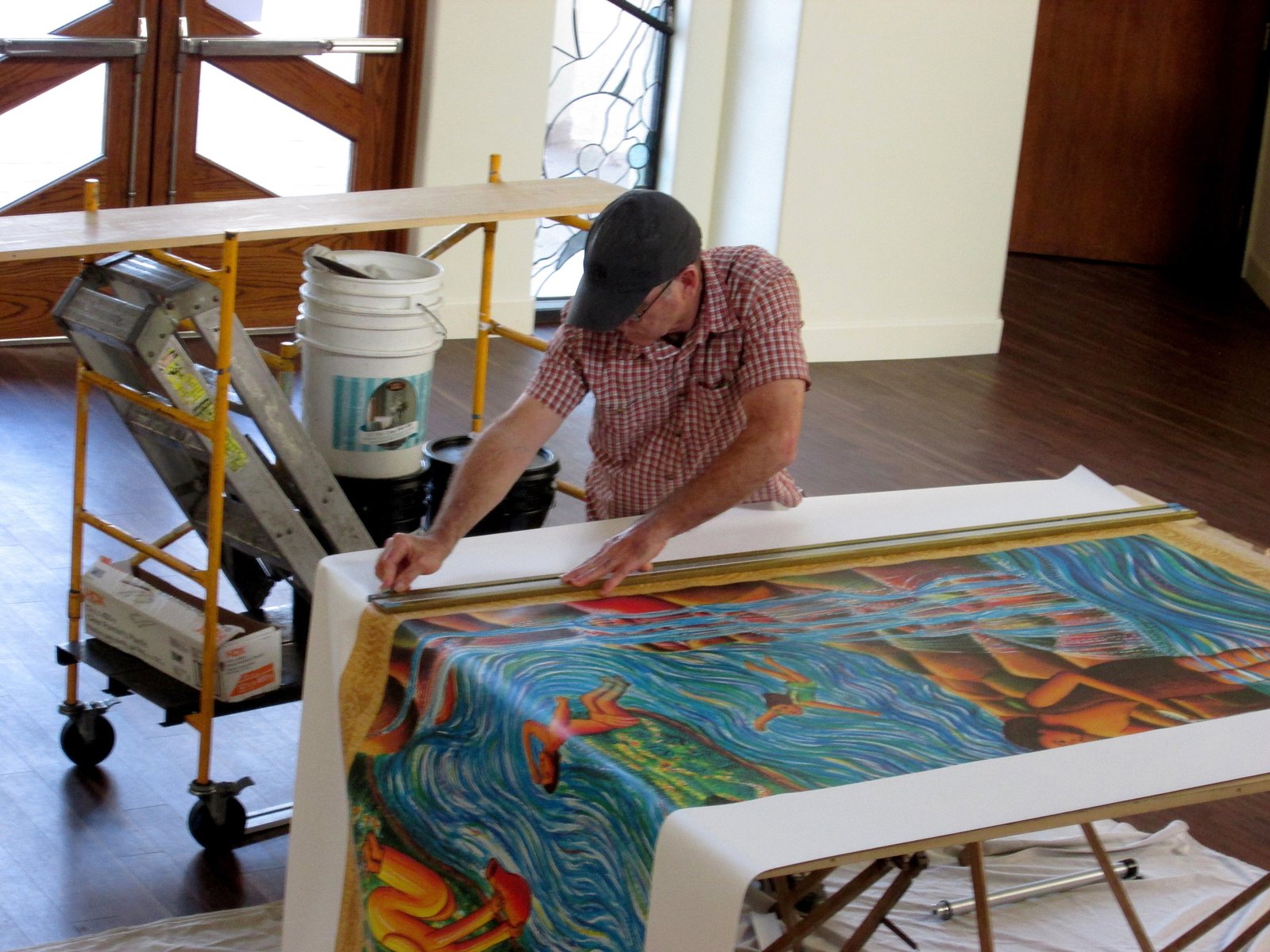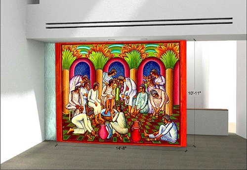 The 18′ x 6′ wall covering of THE RIVER is located in the narthex