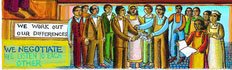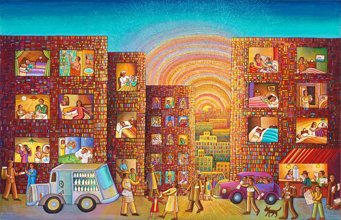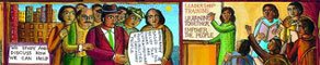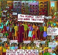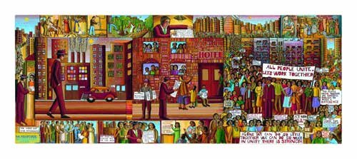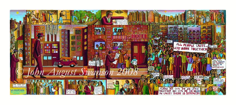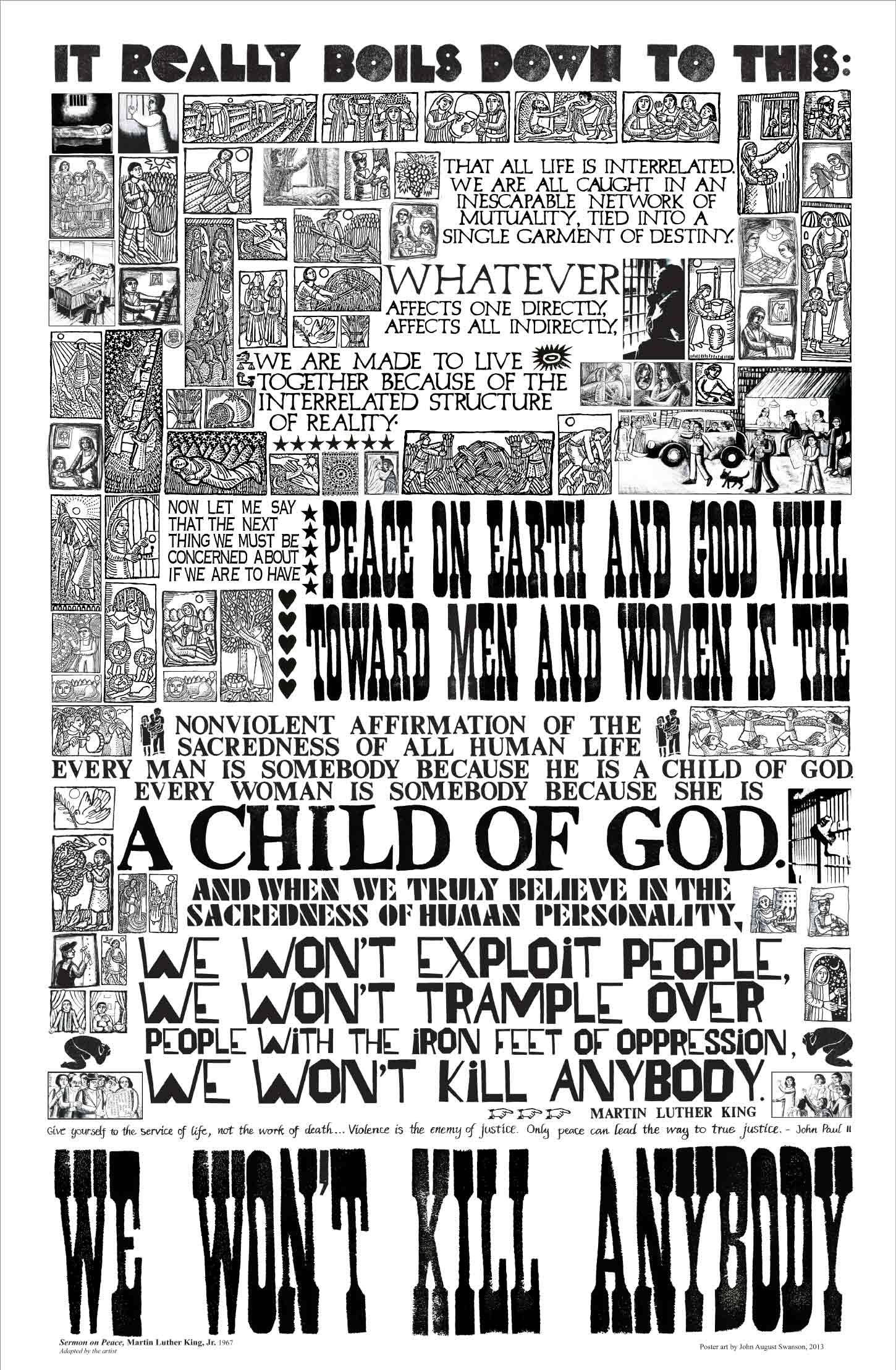 My earlier posters were planned around, and mainly used, photographs, which were interspersed with song lyrics and quoted text. For this work, I chose to use my own drawings. These details have been taken from the paintings, prints, and sketches I have completed over a wide spectrum of my work. The scenes depict people engaged in their daily lives, and form my own visual commentary on Dr. Martin Luther King’s marvelous text. However, within the artwork, there is still a photo of Dr. Martin Luther King, Jr. It was taken in a jail cell at the Jefferson County Courthouse in Birmingham, Alabama, October, 1967. The poster’s text is drawn from Dr. King’s 1967 Christmas Sermon on Peace, delivered at Ebenezer Baptist Church in Atlanta, Georgia. The Canadian Broadcasting Corporation aired the sermon as a part of their distinguished authorities and contemporary interest program, the Massey Lecture series. Dr. King’s affirmation of our universal connection to one another, our inextricable interdependence, moved me. It is still a contemporary, powerful, and relevant message, as we continue learning how to live together, how to work together, and how to peacefully coexist. |