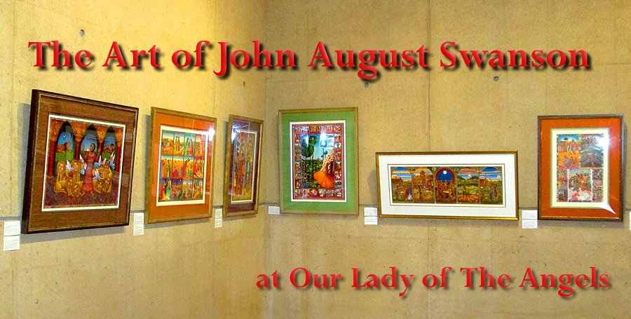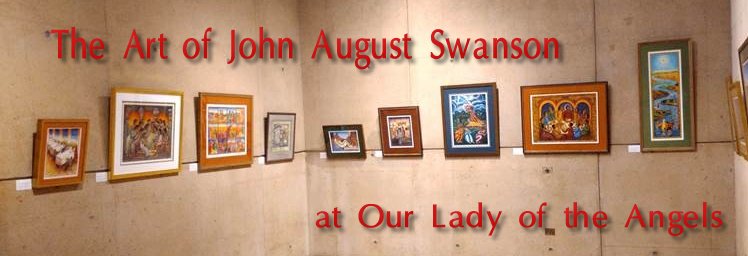 The processional banners for the dedication and opening of Our Lady of the Angels Cathedral featured the art of John August Swanson.