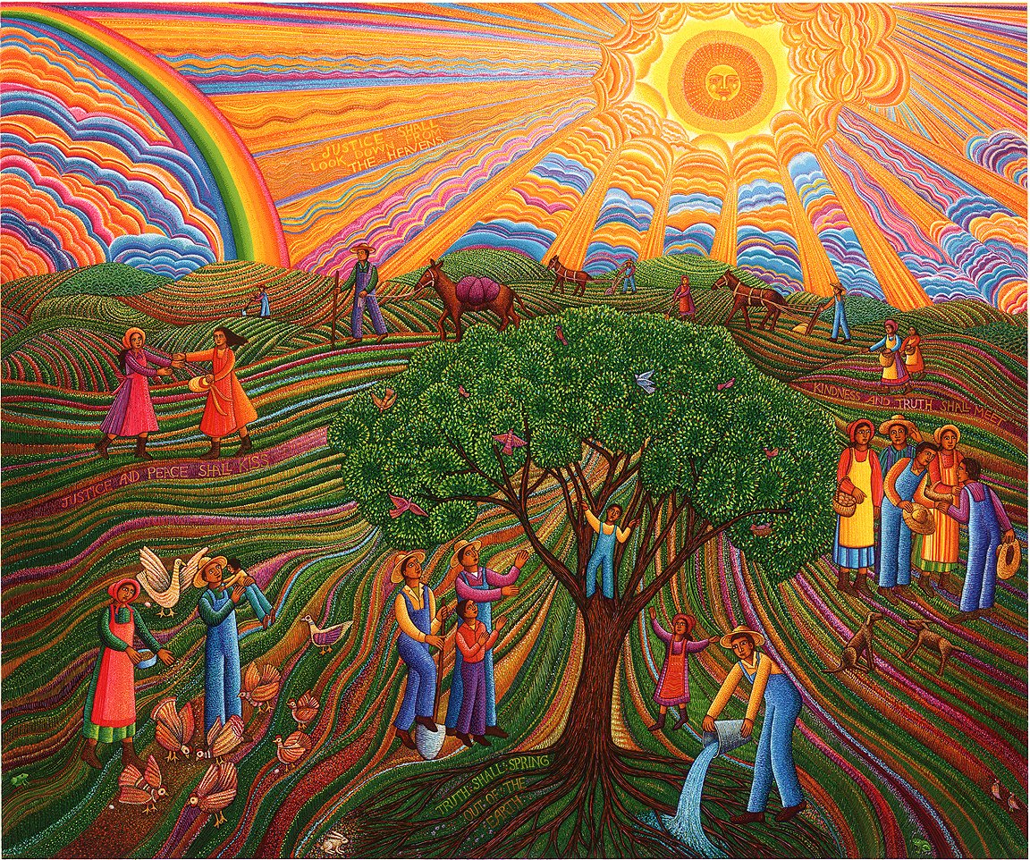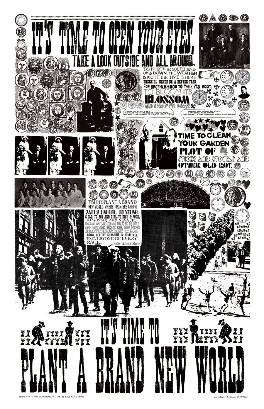 | When I was starting my work as an artist from 1968 to 1975, I was influenced by political ideas and movements, and the songs and speeches of the 1960s and 70s. I created a series of works similar to newspapers-collages of lettering, artwork, and photos, an “exploding newspaper.” I used a large variety of imagery, from photographs to my own hand carved rubberstamps, to create visual interest. It was a good opportunity to incorporate the lettering and alphabets I had carved in my mentor Corita Kent’s lettering class. Using my knowledge of photography, and working in darkrooms, I overexposed photographs to simplify them, and create stark solarized images, which I felt complimented the lettering. I combined the lettering, photos and rubberstamp images with texts that were meaningful to me: the words of the writer, James Agee; the poet, Lawrence Ferlinghetti; and the labor leader, Cesar Chavez; as well as song lyrics. Buffy Sainte-Marie was a strong minstrel, who wrote songs that were about her people’s history, the Native Americans, and about peace and political consciousness. I chose the song she wrote in 1968 for Brotherhood Week, Seeds of Brotherhood, to create one of these “exploding newspapers.” The lyrics are so playful, yet they deal with the importance of understanding, compassion, and empowerment. Yes, we can create a better place where everyone can live!