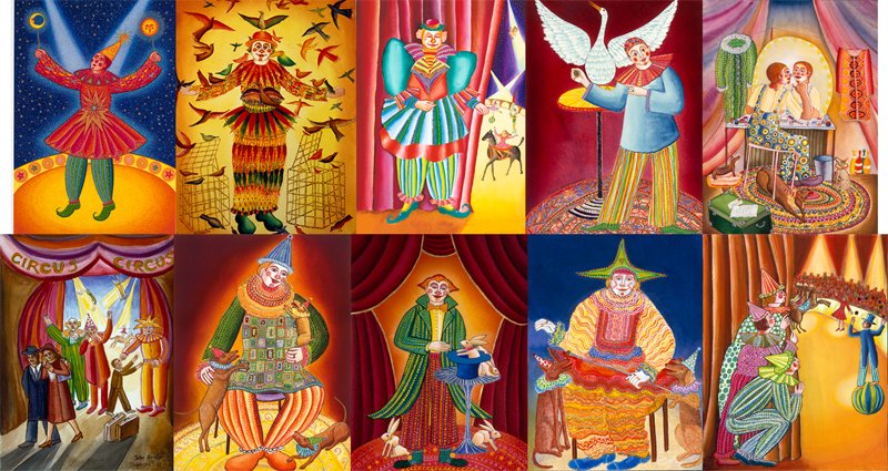 The first two were completed in 2008, please continue to visit the website for updates! The first in the series, STAR CLOWN, is available! The second, PAPAGENO, is also available! The third, GOOSE WITH THE GOLDEN EGG, is NOW AVAILABLE! The other works in the suite (shown above, from left to right) are: CRIMSON CLOWN, GOOSE WITH GOLDEN EGG, CLOWN MAKING UP, BOY JOINS CIRCUS, AMAZING DOG TRIO, MAGIC RABBITS, ORIENTAL PRINCE, and WE’RE ON NEXT. “As I review and enjoy these clown characters, I am moved by feelings of their uniqueness, their ability to touch our lives and their double-sided nature. They are hilarious, mischievous, joyful and full of surprises – turning around the expected order of things. They also appear as messengers who bring us hope, grace, healing and meaning. They connect us to the numinous and to our child-like delight.” -John August Swanson, 2008
