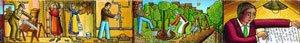 Orbis Books, publishers of There Is A Season, is releasing a new book using John August Swanson’s painting FRANCIS OF ASSISI (1999). This painting has a border of 24 miniature scenes from the life St. Francis. The larger central panel shows St. Francis looking out over a landscape of forests, various animals and birds, rolling hills, and towns. The more than 60 full color inllustrations in the new book are taken from this complex painting, exploring the intricate details.