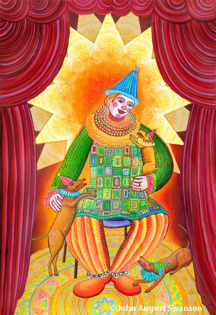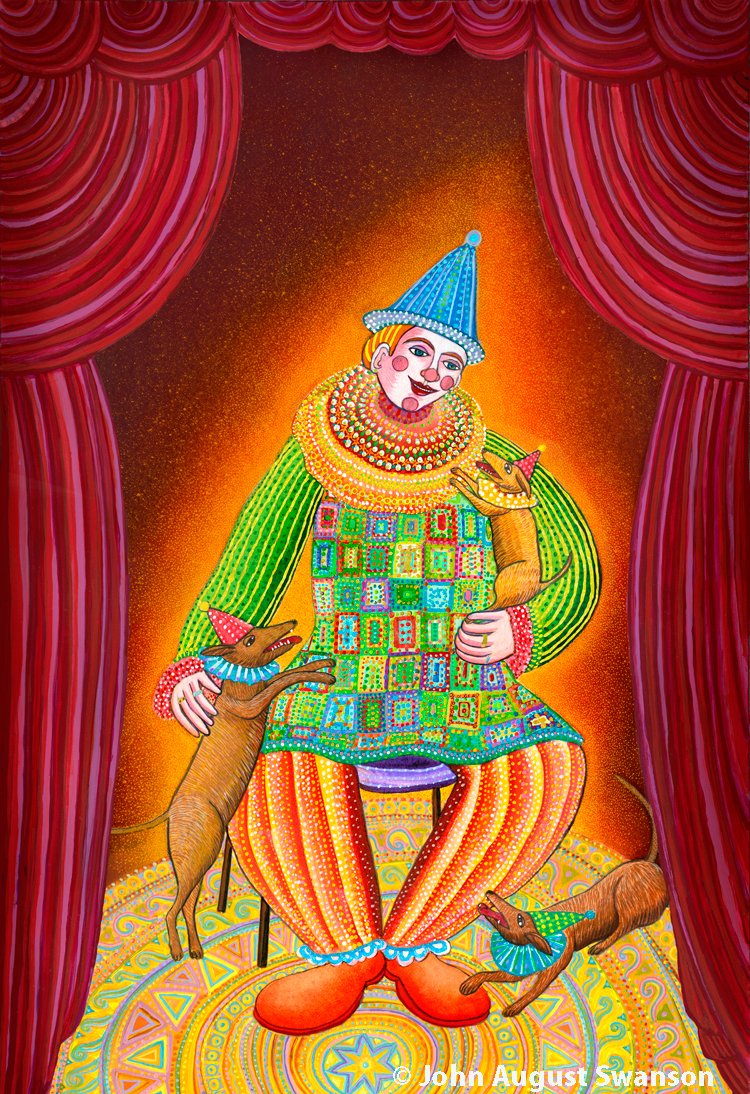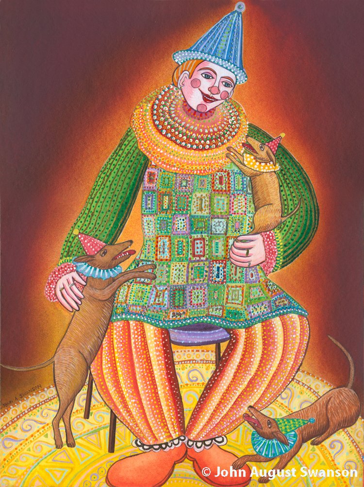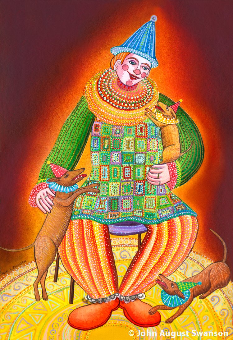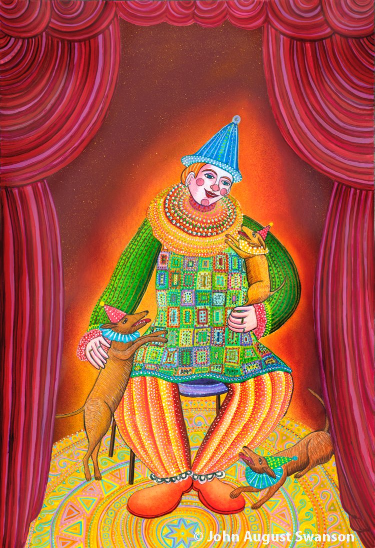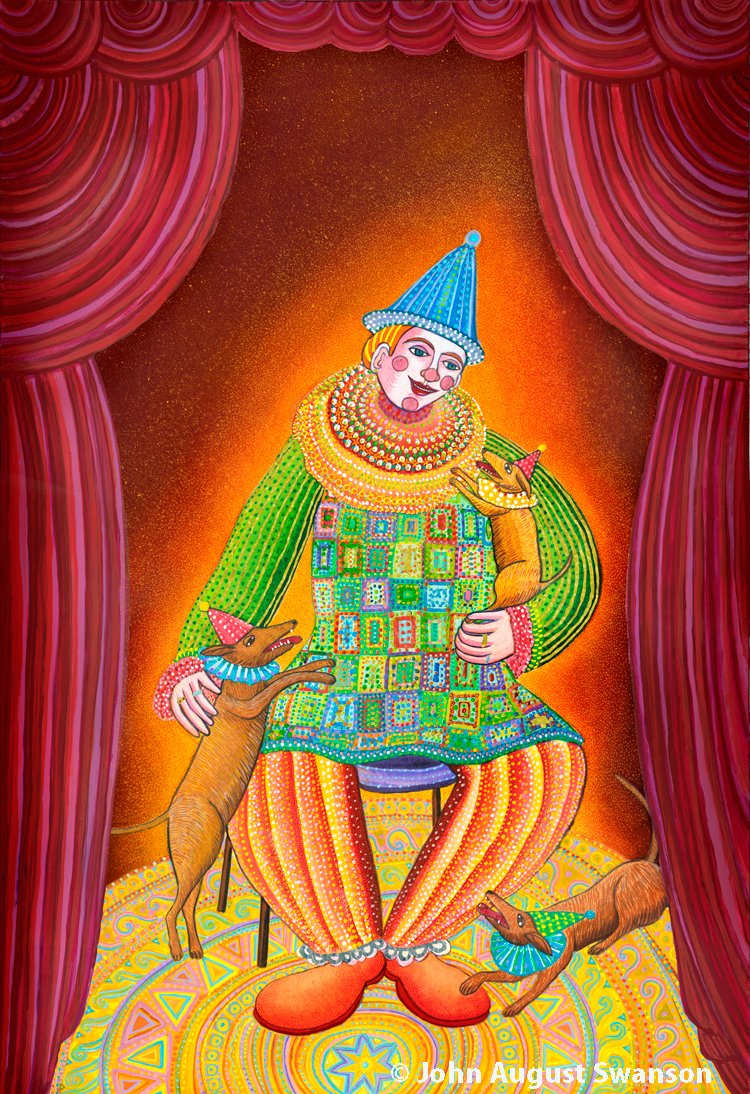 AMAZING DOG TRIO- Giclee Printing In January, 2015, the Studio of John August Swanson re-acquired Swanson’s 1987 Multi-Media (Watercolor and Metallic paints) painting, AMAZING DOG TRIO. The Studio scanned the 12″ x 9″ painting at 1300 DPI on February 2, 2015. Swanson began working with the image to adapt it as a giclee print edition, first changing the the dimensions to 17.5″ x 12″, to match other artworks in his series of Clowns: STAR CLOWN, PAPAGENO, GOOSE WITH THE GOLDEN EGG, and CRIMSON CLOWN. Swanson tried new ideas to enhance the artwork: the size of the figure of the clown was reduced to increase it’s similarity to the other artworks in the clown series; Swanson hand painted a new rug and curtains, and layers of stippling, which were scanned and added to the digital artwork. Two versions were completed, one with a starburst pattern behind the clown, and one without. These proofs were printed, and Swanson chose the version without the starburst experiment. Additional color changes were completed, proofs were printed and inspected, and shadows and highlights were added to the piece. On September 23, 2015, the final giclee print file was completed and approved by John August Swanson; this is the file Kolibri Art Studio in Torrance, CA uses to print the edition. On October 2, 2015, the first five giclee prints from the edition were inspected, approved, and signed by John August Swanson. | |||