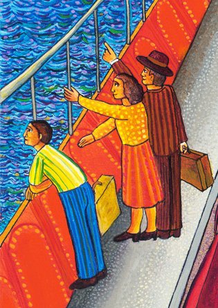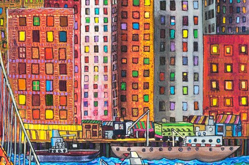 Adapted from a 1984 acrylic painting, THE BRIDGE is a melding of my memories of living in London and crossing bridges over the Thames, as well as my experiences in America crossing the Golden Gate, Manhattan, and Brooklyn bridges to enter large urban cities. It is painted in my own style, and, while it relates to real locations, it is my own bridge leading to a bustling metropolis of my own imagination.