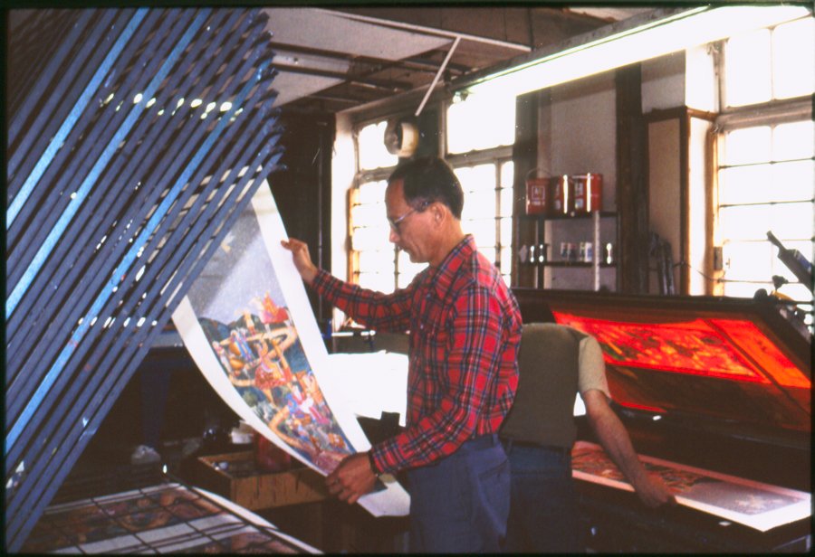 EPIPHANY depicts the journey of the three Magi as they travel up a serpentine trail. One of the Wise Men is seated as he looks at a map of the constellations with his magnifying glass; his servant holds a lamp so that he can see. Another Magi searches with his telescope into the sky. They look up in search of their beautiful guiding star as angels surround and point to it. They have exotic birds, peacocks, and dogs among their animals. I have tried to capture the details of the many plants, bushes, and trees and to create a variety of colors of green.