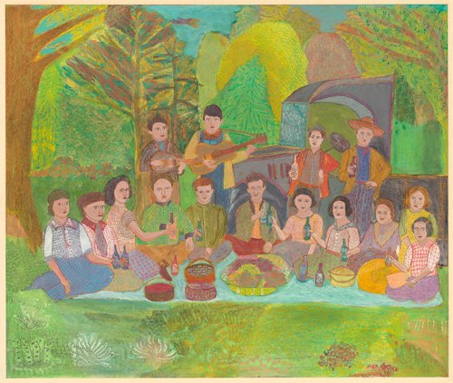 | Crayon Scrafitto Painting The small 3½” x 5” photo was in poor shape, very damaged and worn. I decided to recreate the photo in a crayon scrafitto painting in 1973. I started with a drawing. Over the drawing, I painted transparent dyes and watercolors. Over that, I applied many layers of crayon and oil pastels, building the surface for the painting. I used the technique of scrafitto, carefully drawing/scratching with a pointed instrument through layers of wax crayon. I drew many patterns and textures for the trees and grasses, as well as on the clothing. For me, it was an elaborate artwork at the time. The painting captures a universal quality of family gatherings, of memories of our families and our roots. The human experience of our connections to the past—laughter, stories, kindness, sharing, and eating as we gather together, is expressed in this artwork. The other universal aspect is the sharing of food. This includes all the preparations, journeys; and sharing for the meals. Food brought us together – as it has for the story of humanity. I was unsure about sharing this work with people. It is so personal and particular to my family, that I didn’t know if it would be relevant for my friends and collectors. But the more I worked on the image, the more I saw it reflecting our shared connection to humanity. It is not just one family, but a meditation on memories of family gatherings and celebrations, even in times of difficulty. |