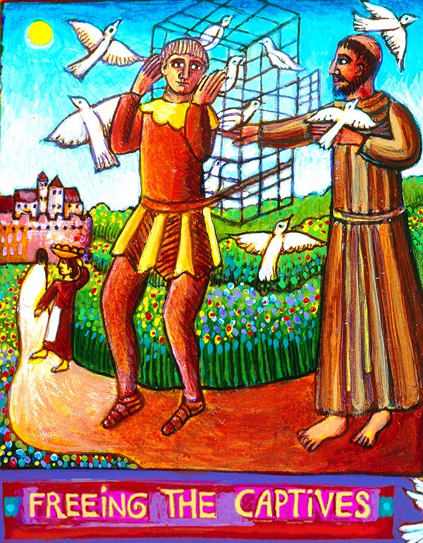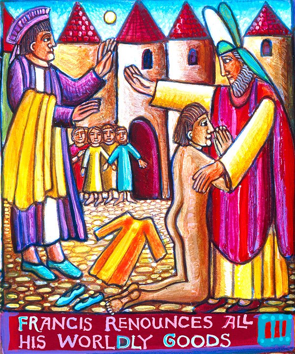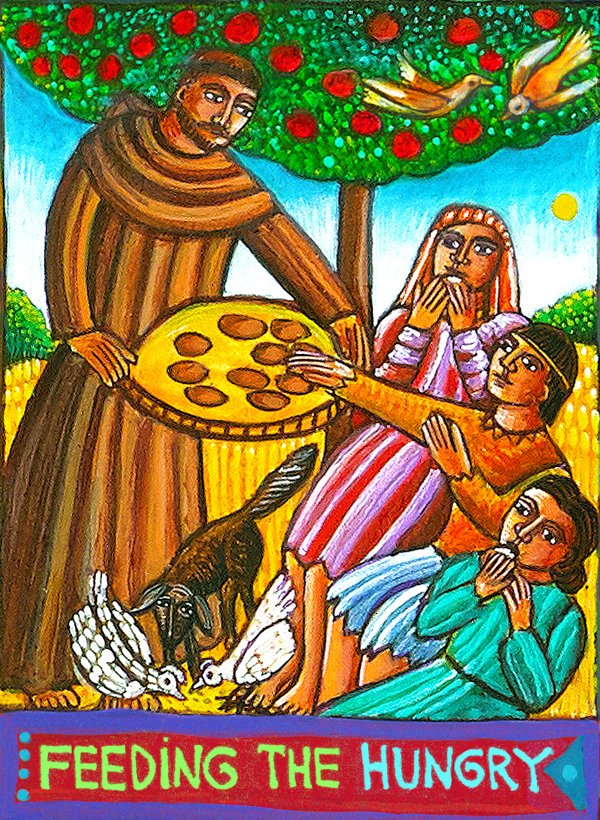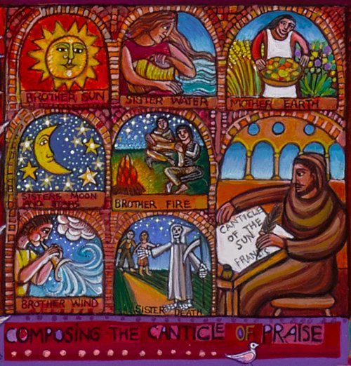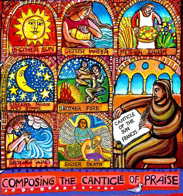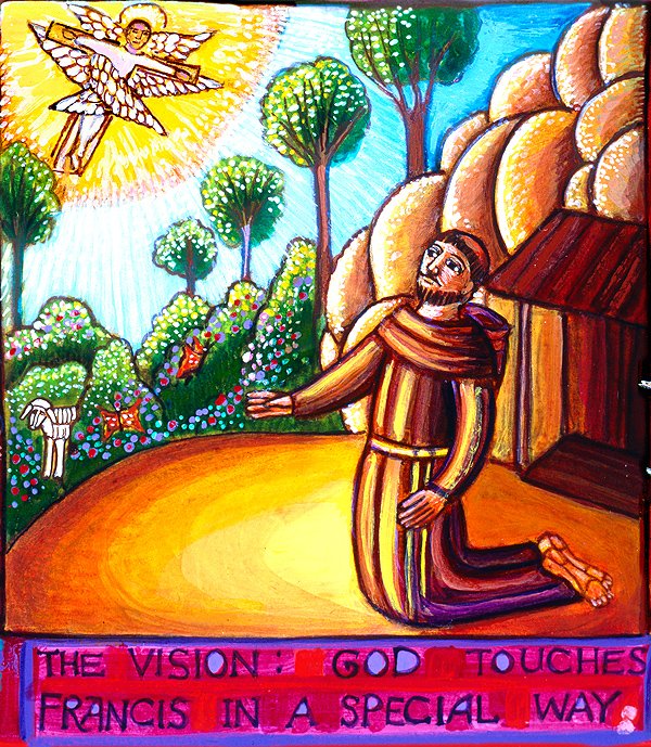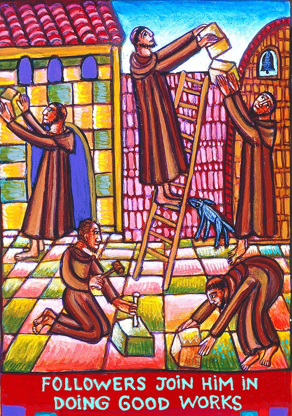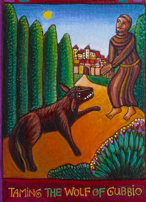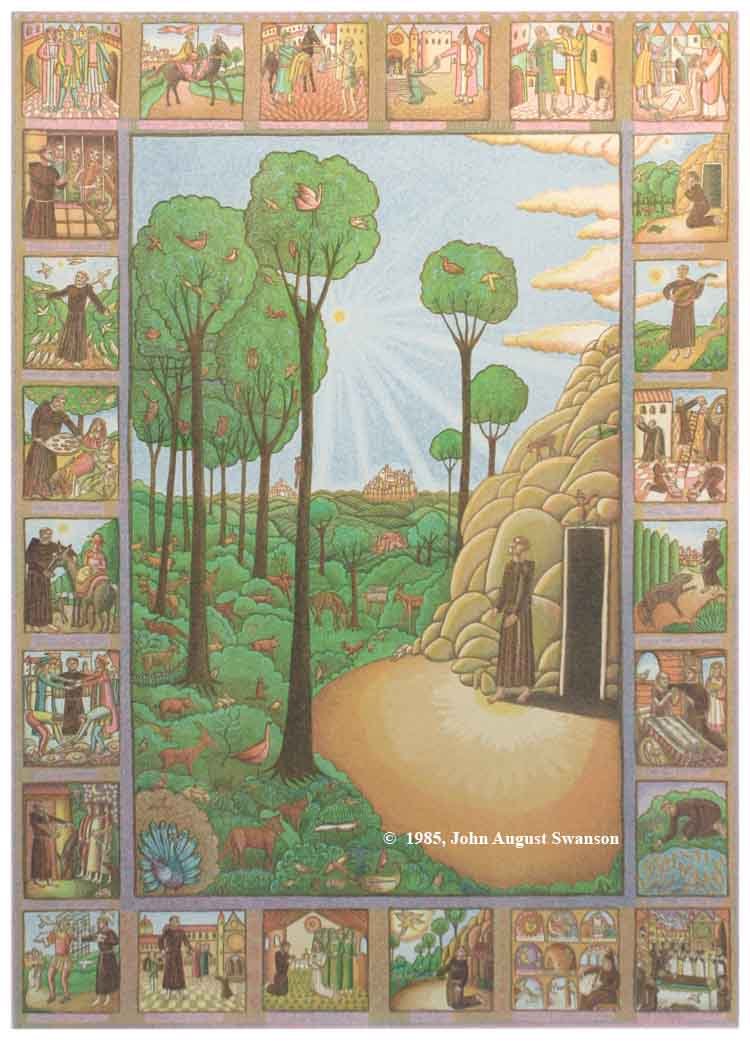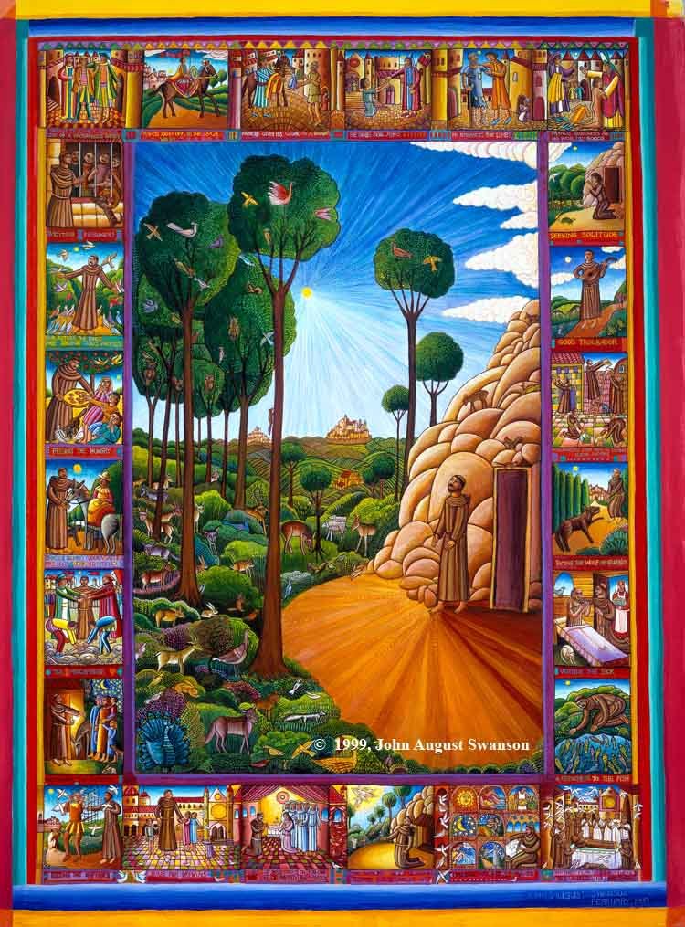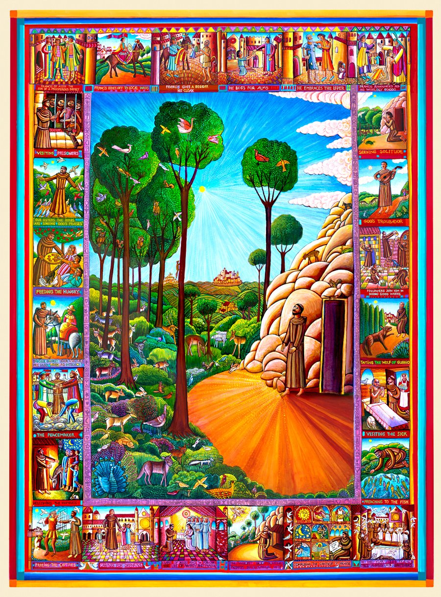 Bordering the central image are 24 scenes depicting a visual biography of Francis’s life. The scenes show Francis caring for nature and all creation, helping and empowering people on their journeys through life.