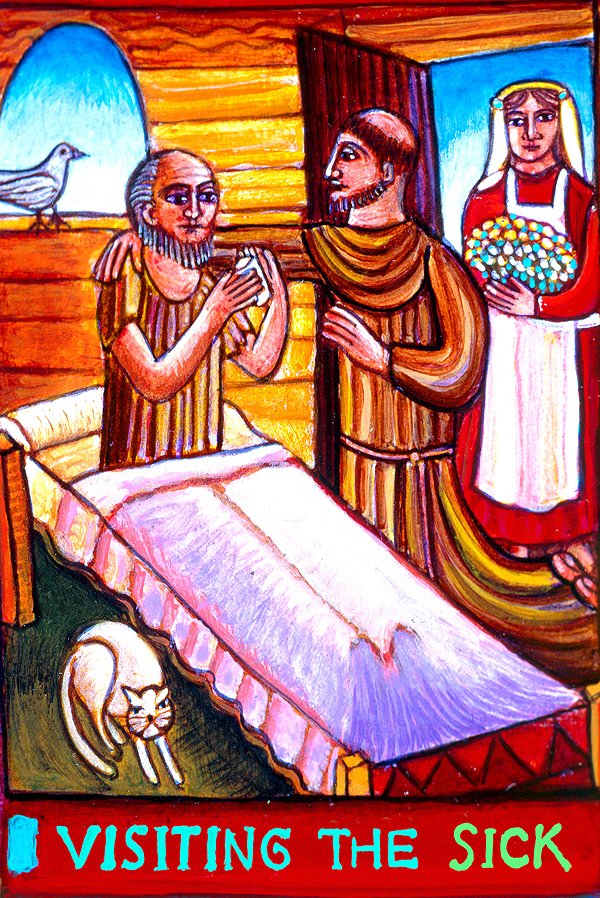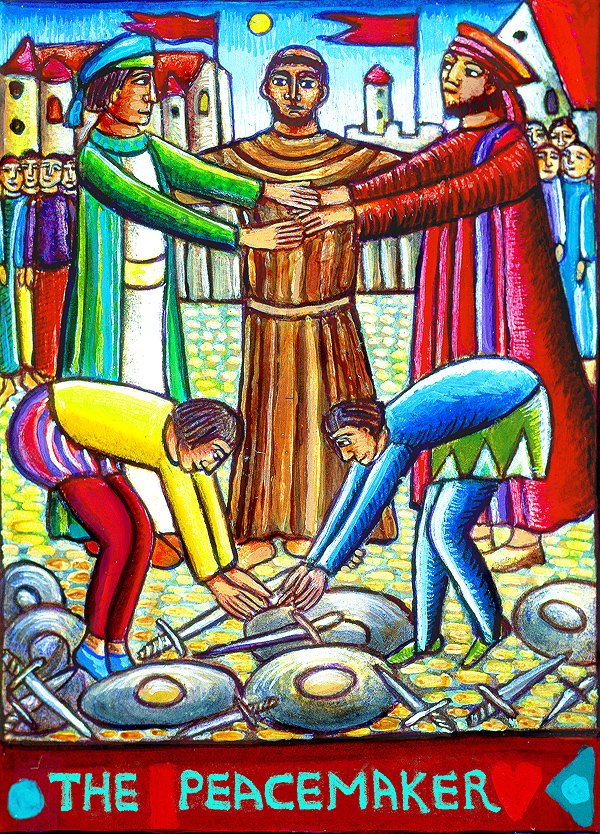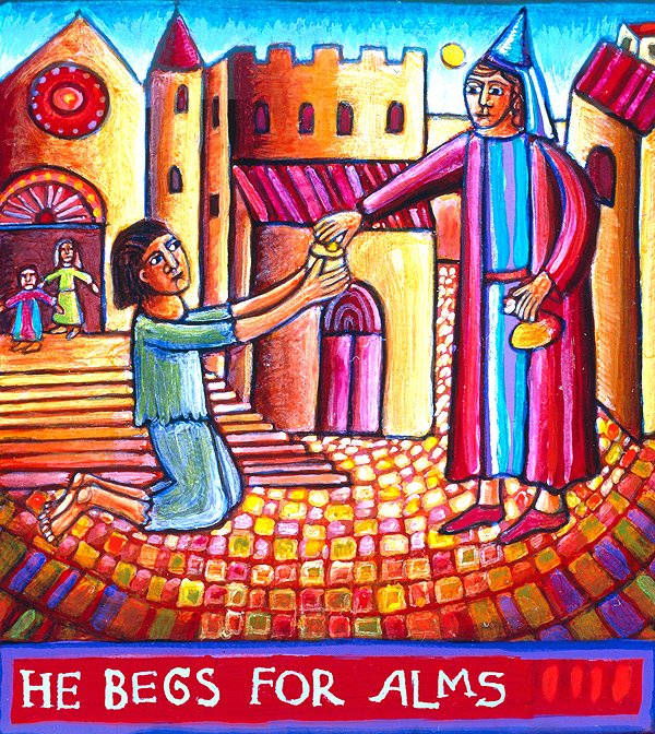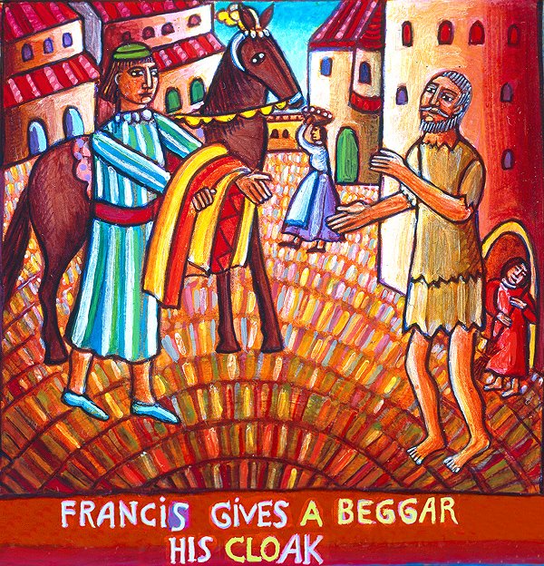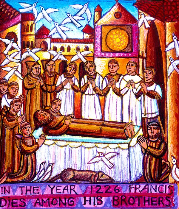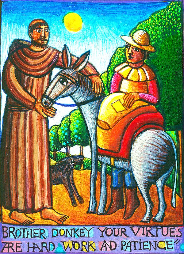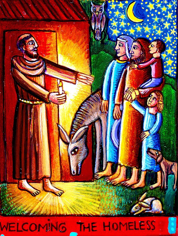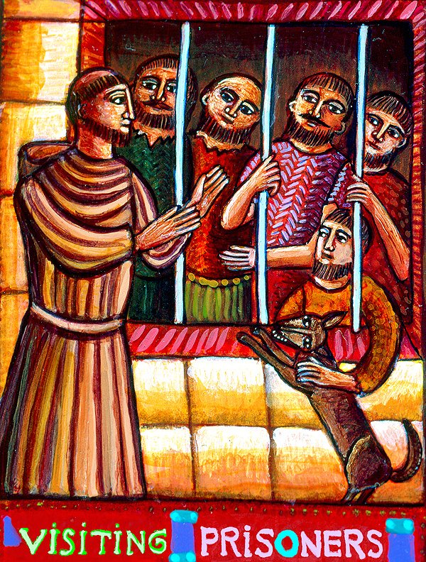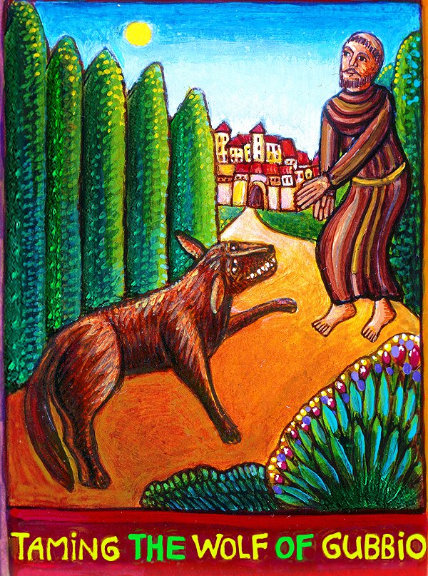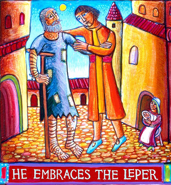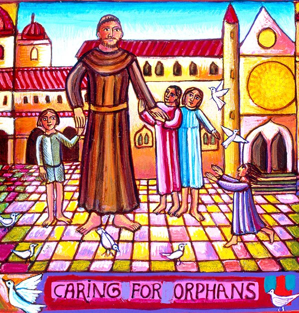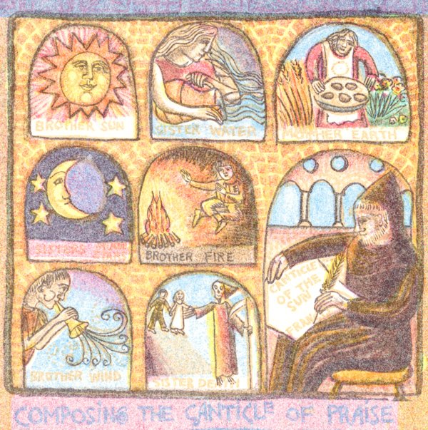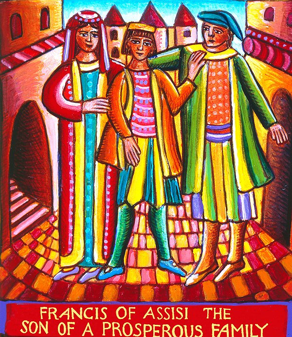 Bordering the central image are 24 scenes depicting a visual biography of Francis’s life. The scenes show Francis caring for nature and all creation, helping and empowering people on their journeys through life.
