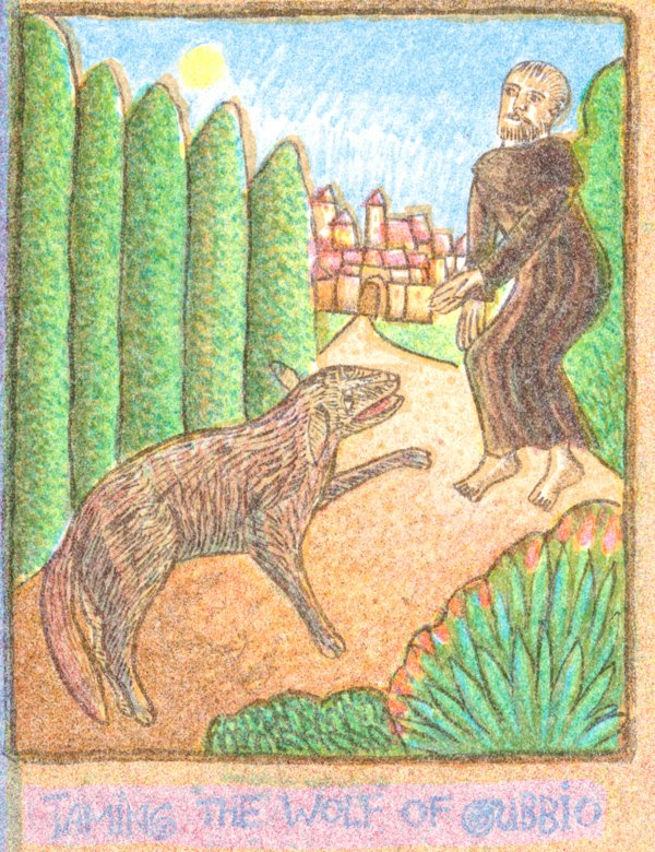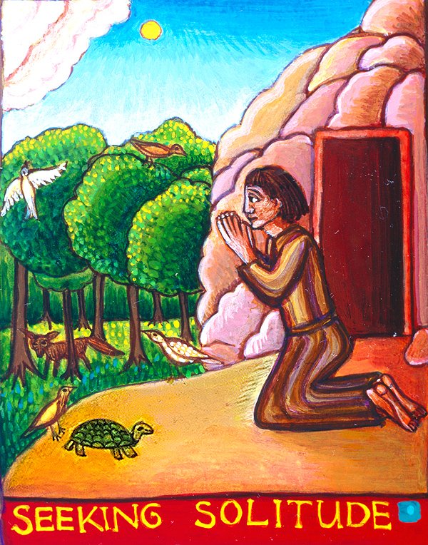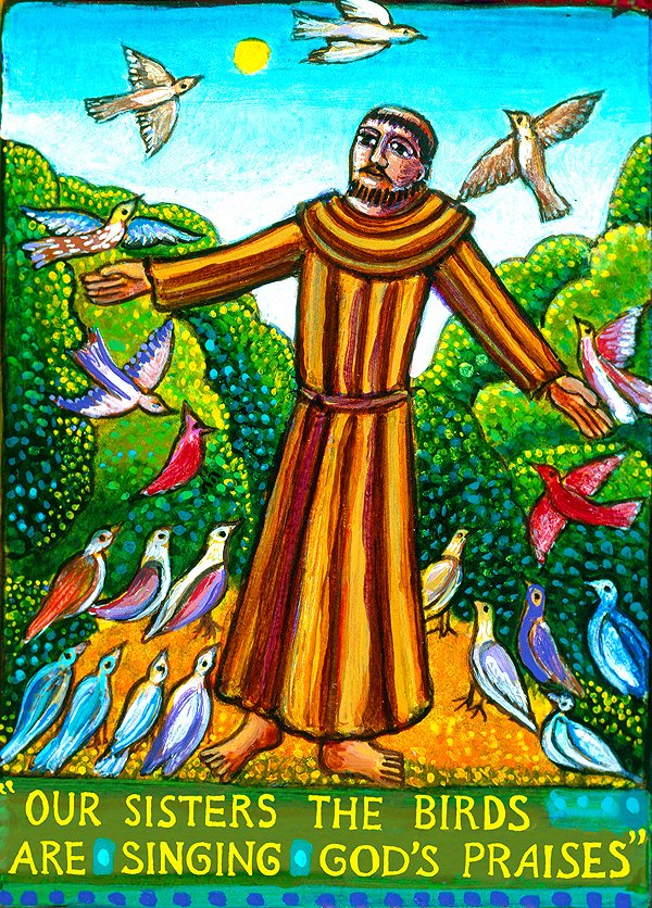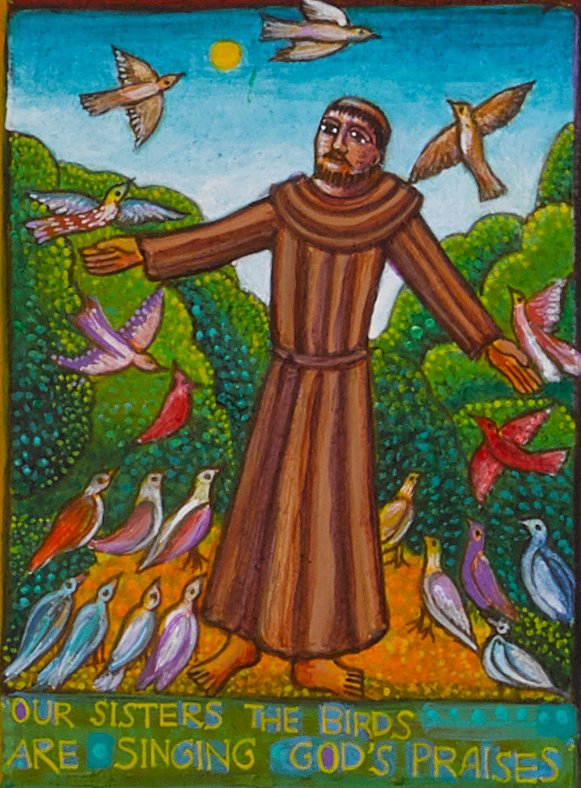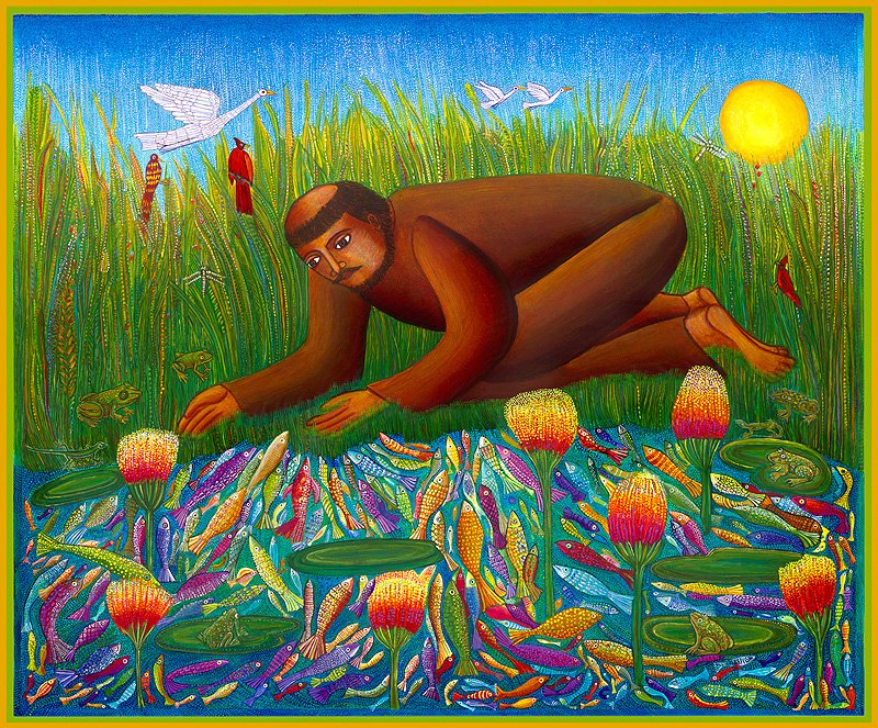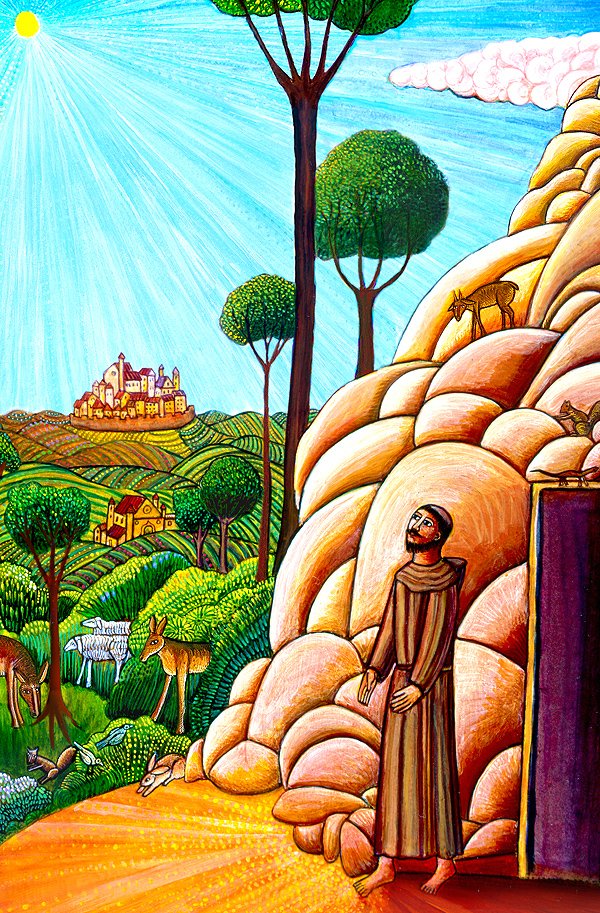 Francis looks out to the distance in wonder, through dense foliage and over green hills to faraway towns. He welcomes the morning with his brothers and sisters, the colorful animals of the forest, and he contemplates our place in creation.