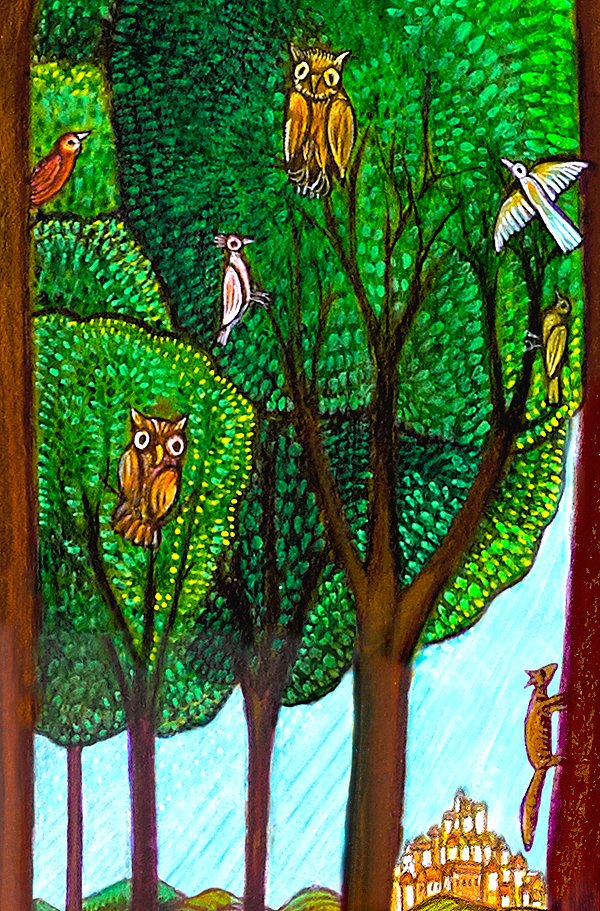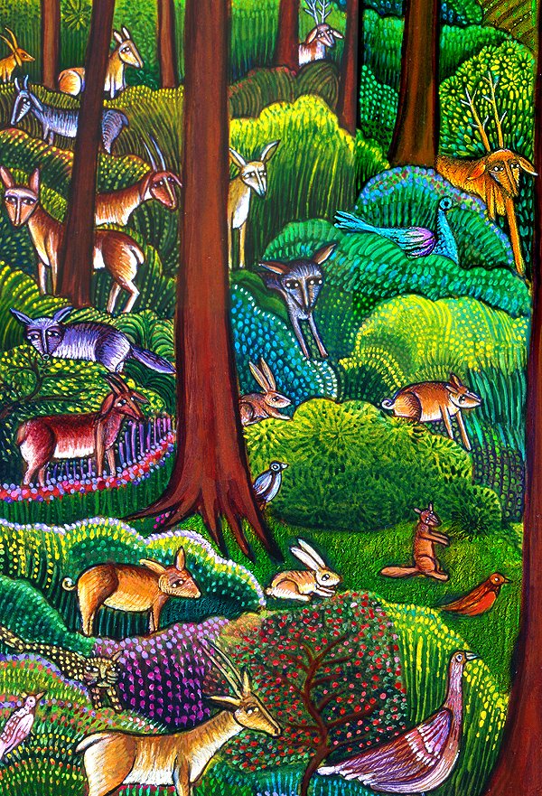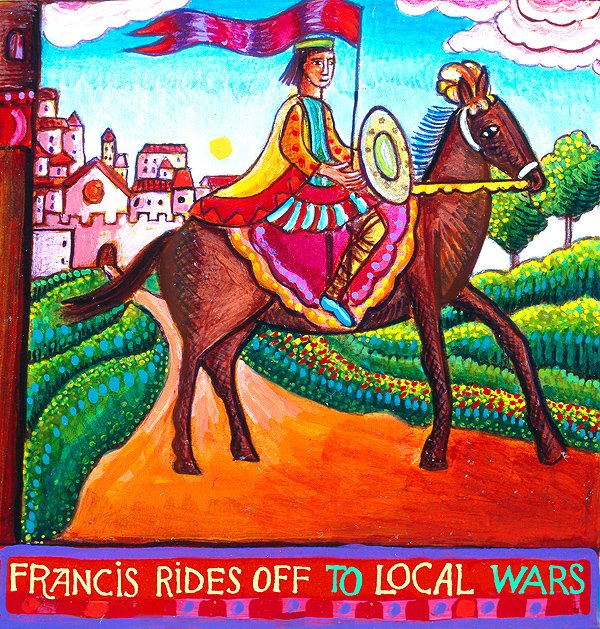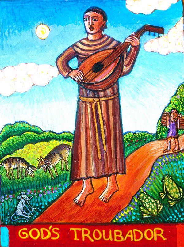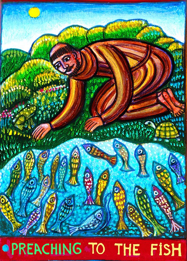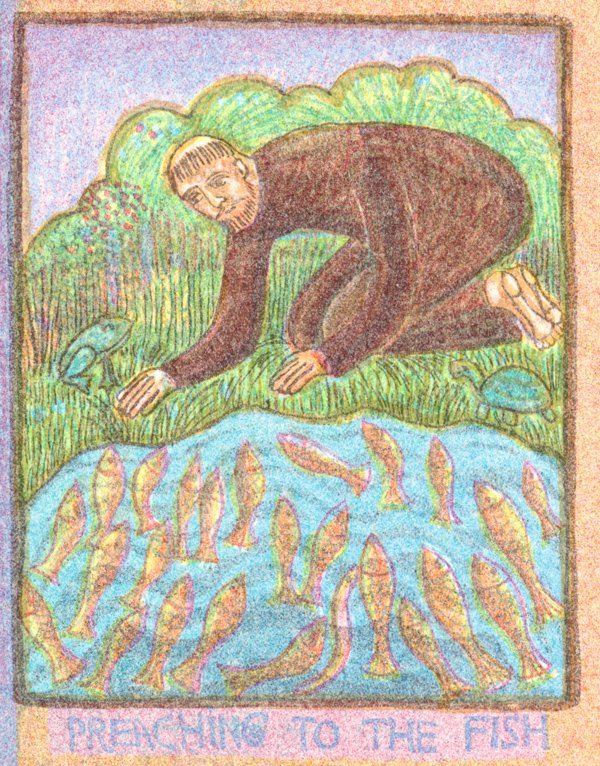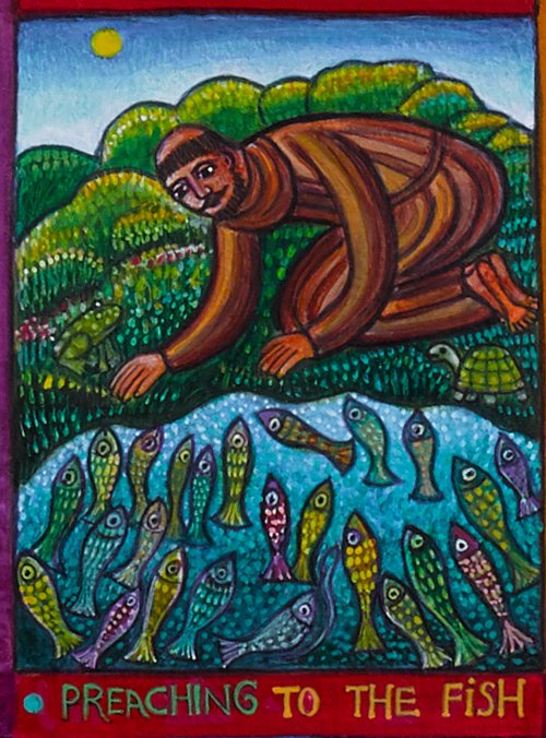 Francis looks out to the distance in wonder, through dense foliage and over green hills to faraway towns. He welcomes the morning with his brothers and sisters, the colorful animals of the forest, and he contemplates our place in creation.