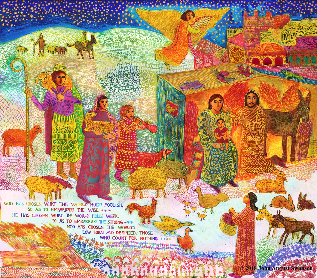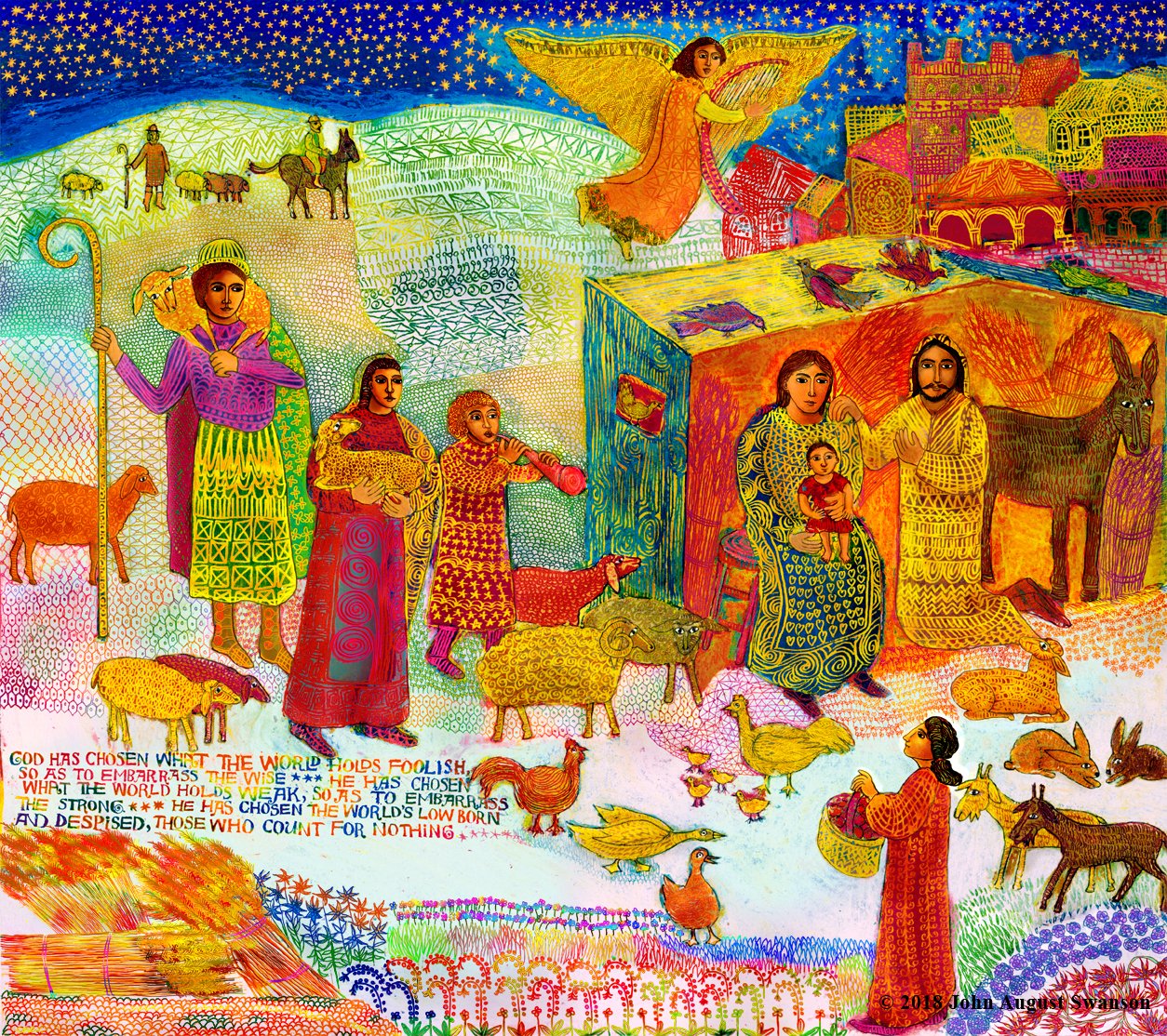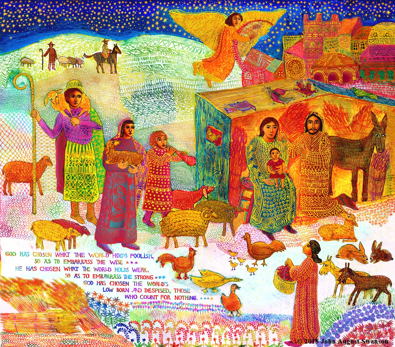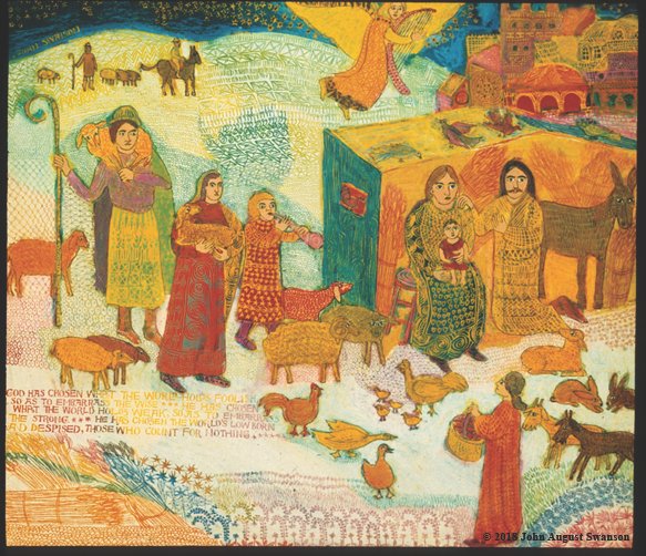 The beautiful tradition of families making creches (or Nacimiento) with many figures and animals in miniature, to celebrate the holiday, inspired Swanson. Combining this powerful image with the words from St. Paul’s letter to the Corinthians (1 Corinthians 1:27-28), gave the Christmas story a more socially relevant context, bringing it into our every day lives.