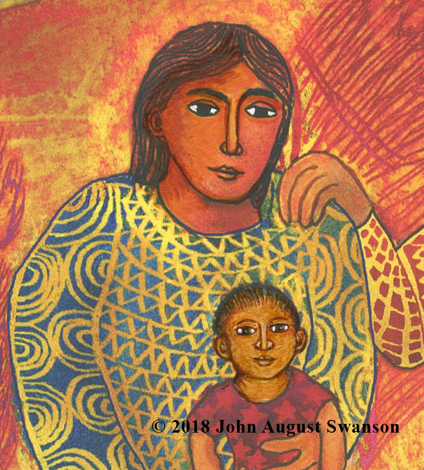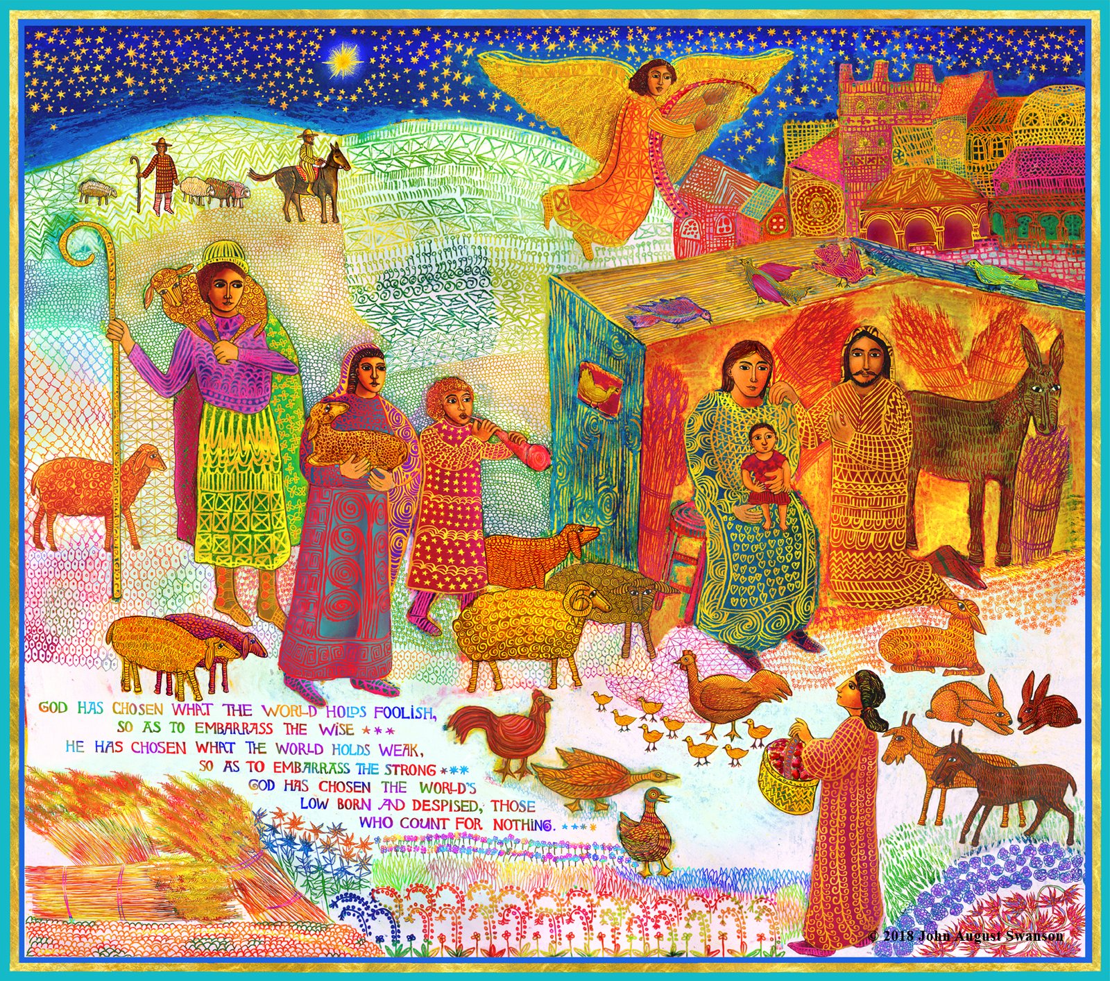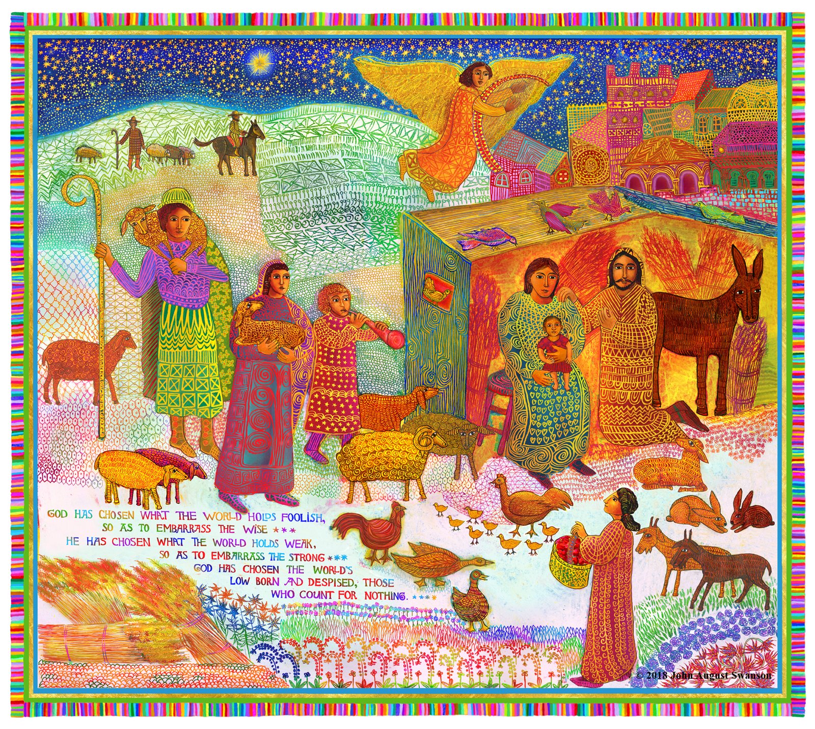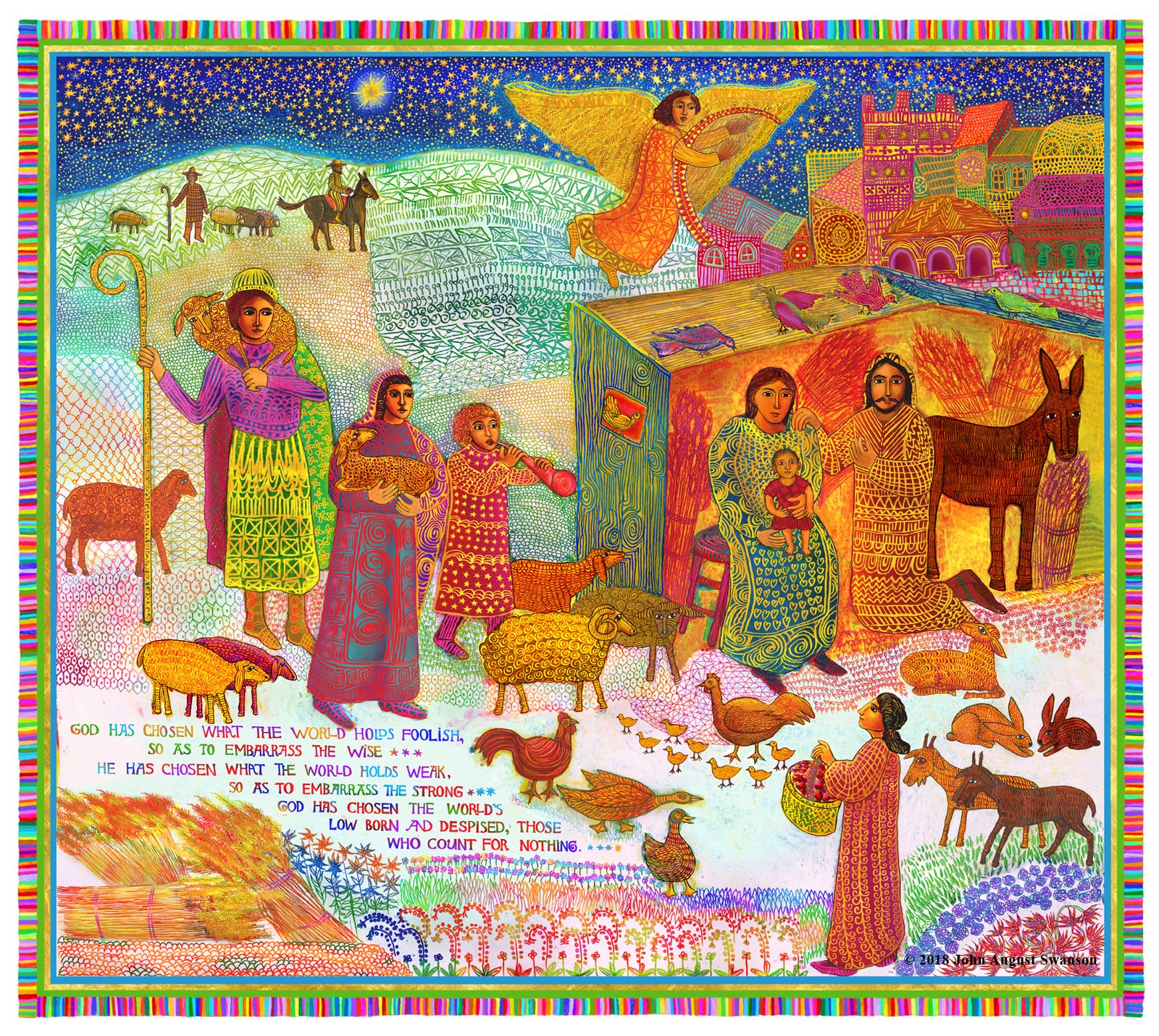 The beautiful tradition of families making creches (or Nacimiento) with many figures and animals in miniature, to celebrate the holiday, inspired Swanson. Combining this powerful image with the words from St. Paul’s letter to the Corinthians (1 Corinthians 1:27-28), gave the Christmas story a more socially relevant context, bringing it into our every day lives.