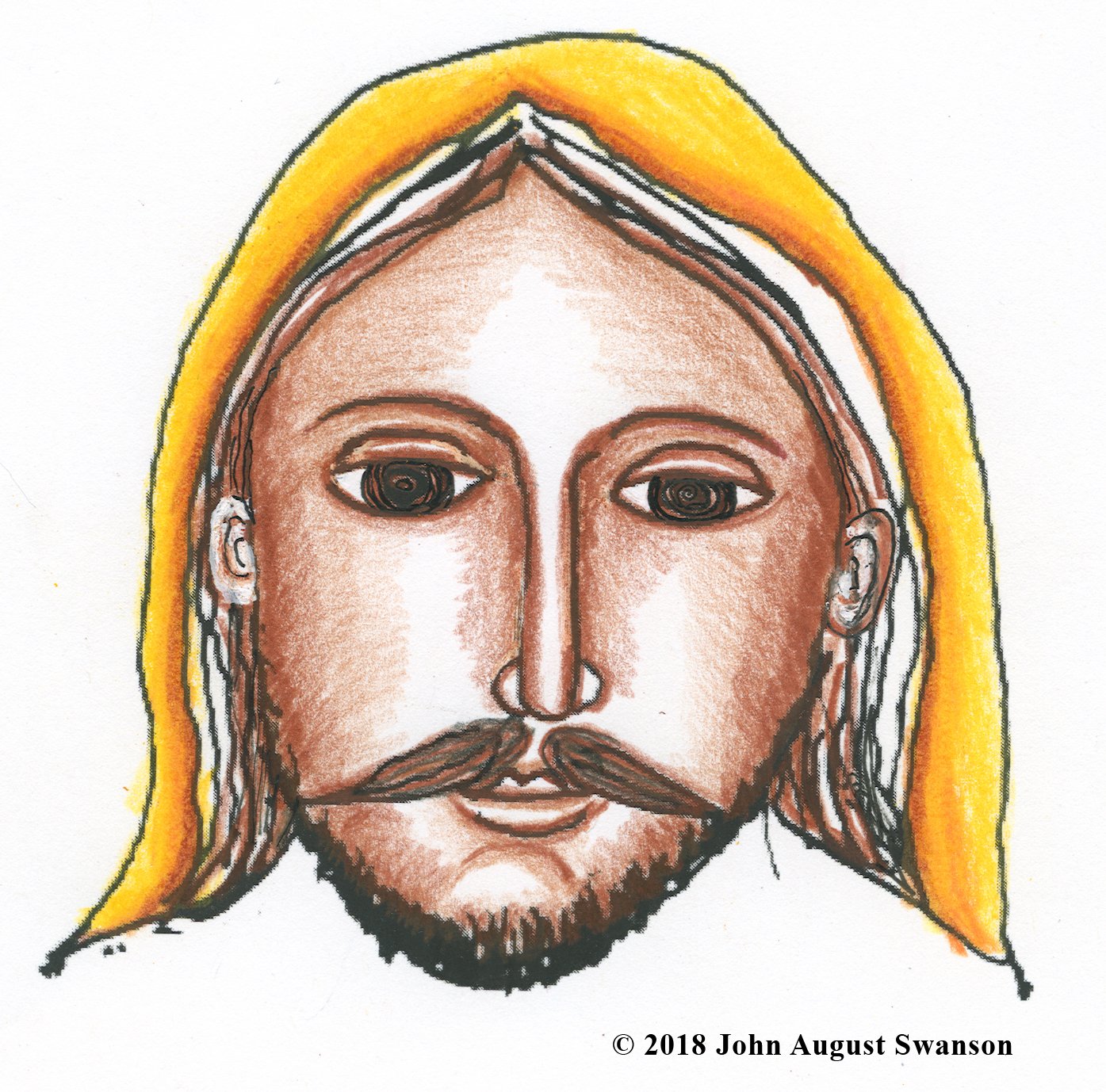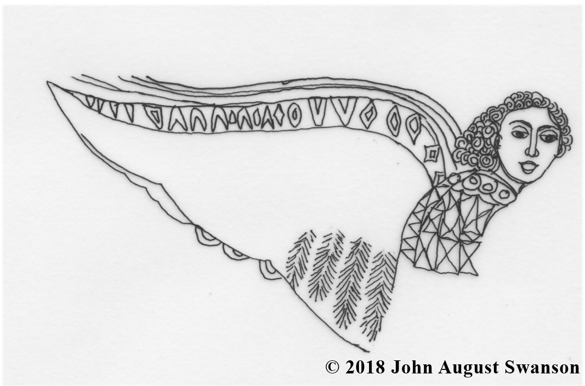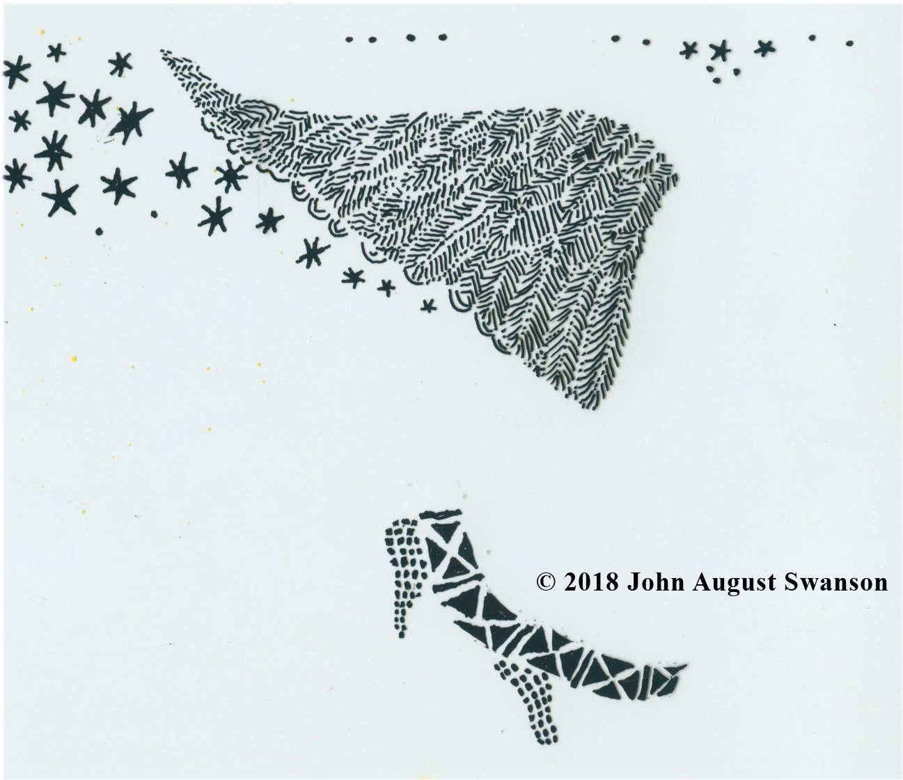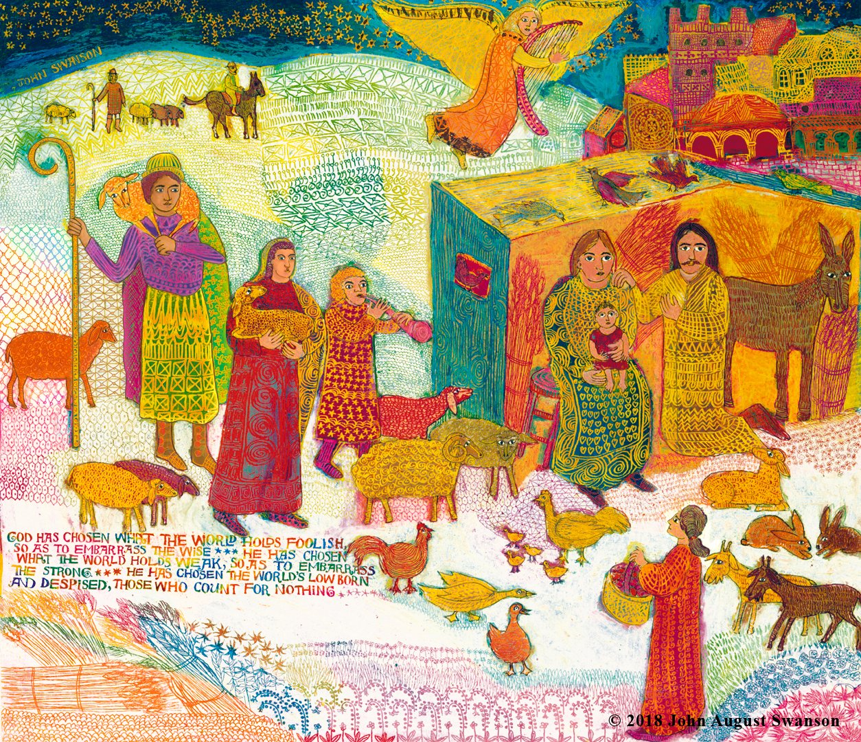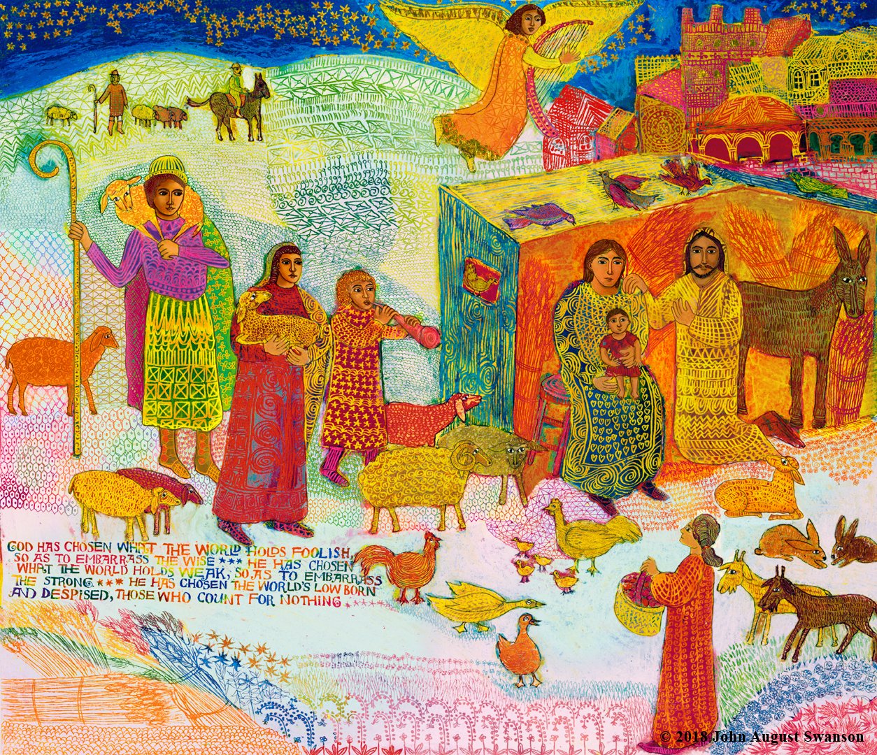 Swanson first painted the Shepherds in 1969, layering different colors of crayon, then scratching patterns of varying depth, to reveal the color desired color, a technique called Crayon Sgraffito. In 2017, he revisited the painting, reimagining it, enhancing and reworking the image, with the experience and techniques he had developed over the intervening decades, preserving the freshness and simplicity of the original.